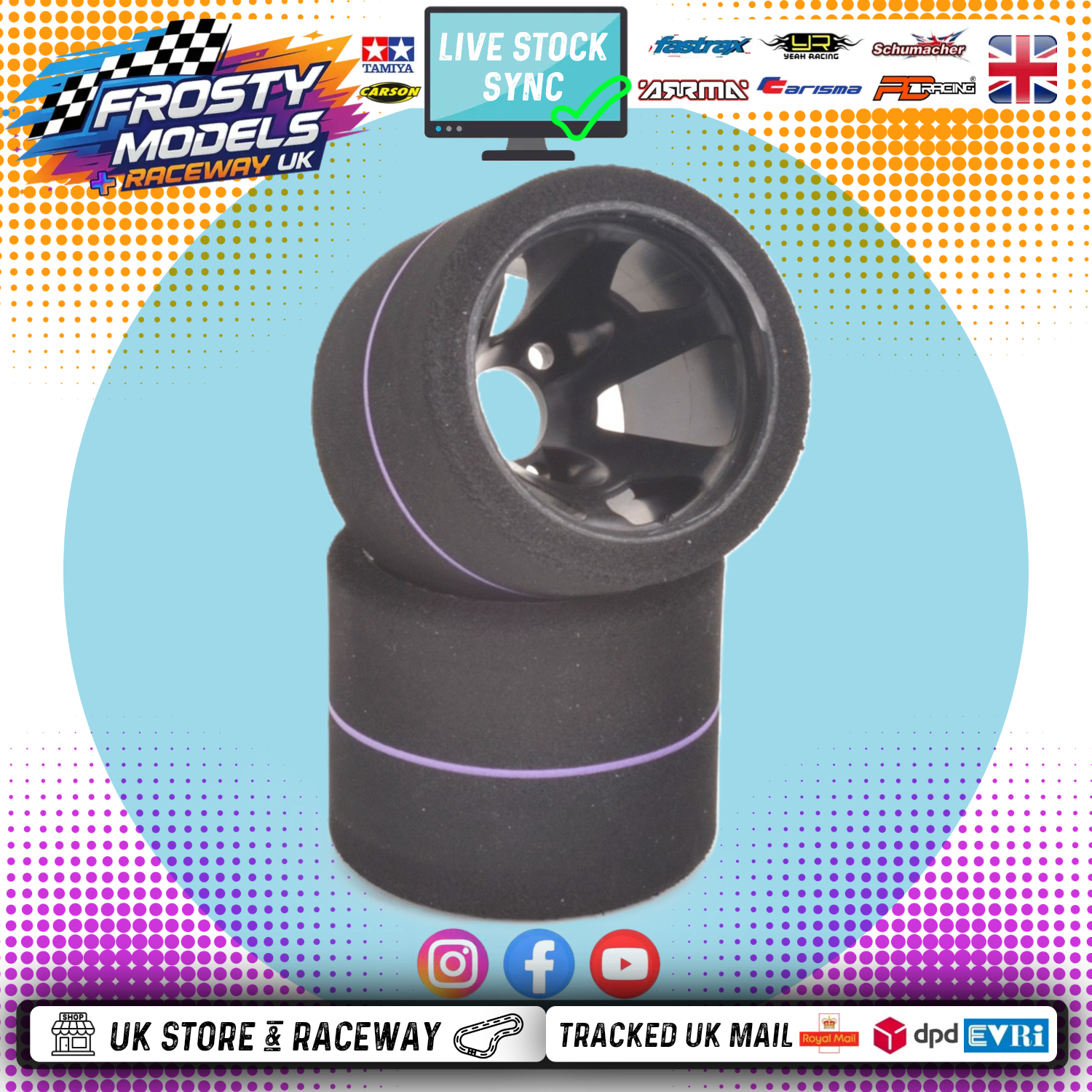 Using 38 shore foam and adding a purple stripe to recognize the compound, mounting it on our rim black 1/12 black carbon rim the tyres perform excellently. These tyres are suitable for high grip American style tracks and work with the most popular additives.