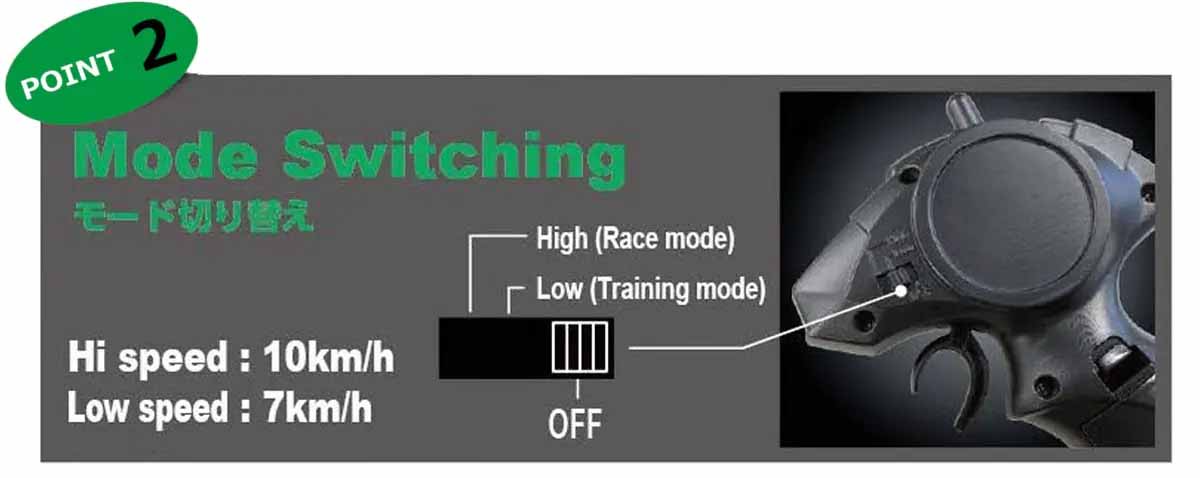 - Maximum speed: Training mode: 7km/h Racing mode: 10km/h