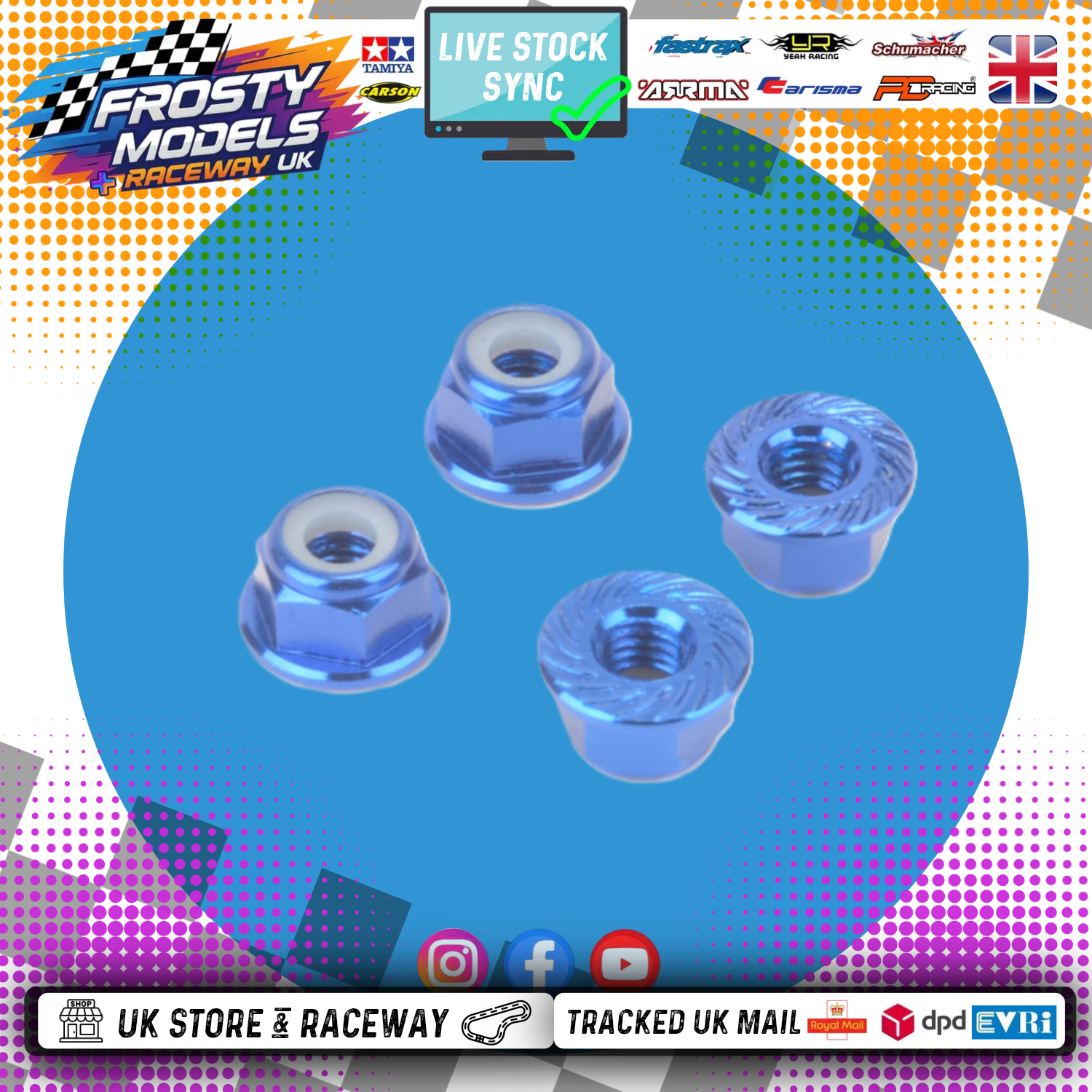 MK - M4 1/10 WHEEL NUTS (7mm Socket) - Blue FLANGED & Serrated LOCKNUTS (4PC) MK5485BL