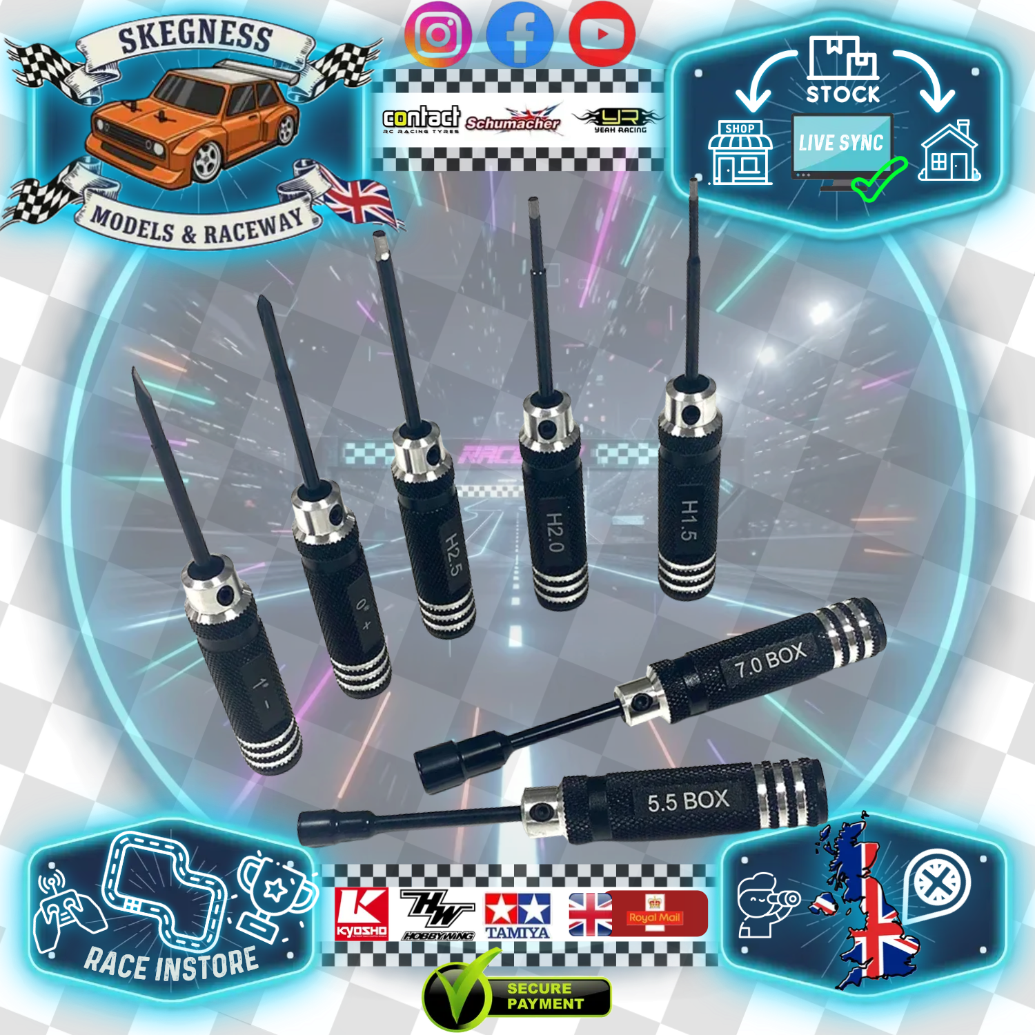 Precision ground tips including popular hexes in 1.5mm, 2.0mm and 2.5mm. Box wrenches in 5.5mm (M3) and 7.0mm (M4), a posi and a flat blade screwdriver.