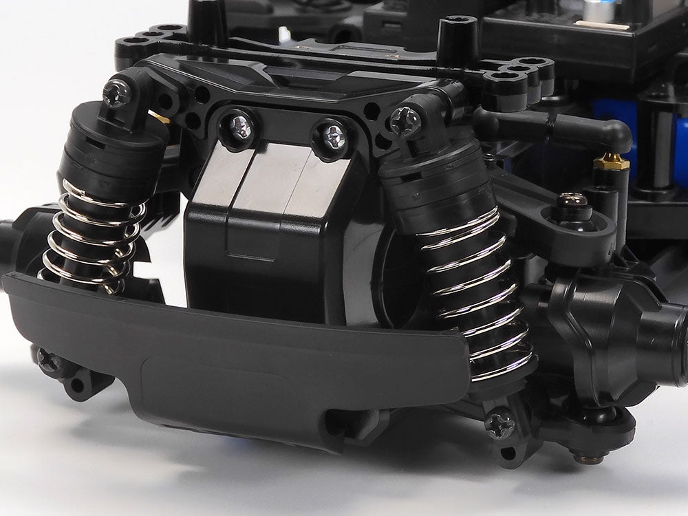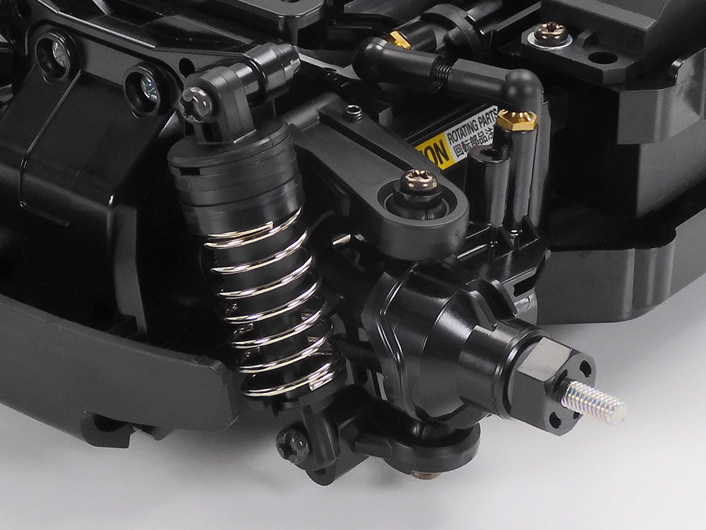 The compact, 2WD MB-01 chassis gives a choice of three types of wheelbases, and front- or rear- wheel drive system. This model employs a midship motor, rear-wheel drive setup. Without removing battery pack, motor, and R/C equipment setups from the centre frame, simply change attachment directions of final gears and steering linkage to switch between front- and rear-wheel drive; low or high motor position can be chosen for rear-wheel drive cars. The 4-wheel double wishbone suspension features symmetrical structure and friction dampers. Unitized sections such as motor mount, final gears and suspension facilitate ease of assembly and effective maintenance.