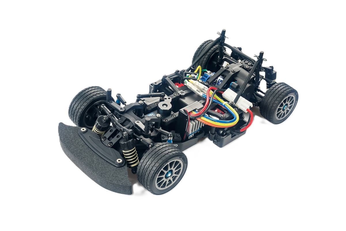 This TAMIYA high-performance rear-wheel drive R/C chassis assembly kit is constructed around a rigid monocoque with the main frame split into front and rear sections. It offers superior rear high traction drive characteristics and fuss-free maintenance of parts such as the easy-access differential. C.V.A. (Constant Volume Adjustable) oil shock-damped 4-wheel double wishbone suspension features dedicated long arms and steering linkage components for a range of setup options. A silky-smooth drivetrain utilizes full ball bearings, oil-filled gear differential unit and universal drive shafts. It can be assembled with a 210mm (S), 225mm (M) or 239mm (L) wheelbase, making it compatible with appropriately-sized existing Tamiya M-chassis body parts sets.