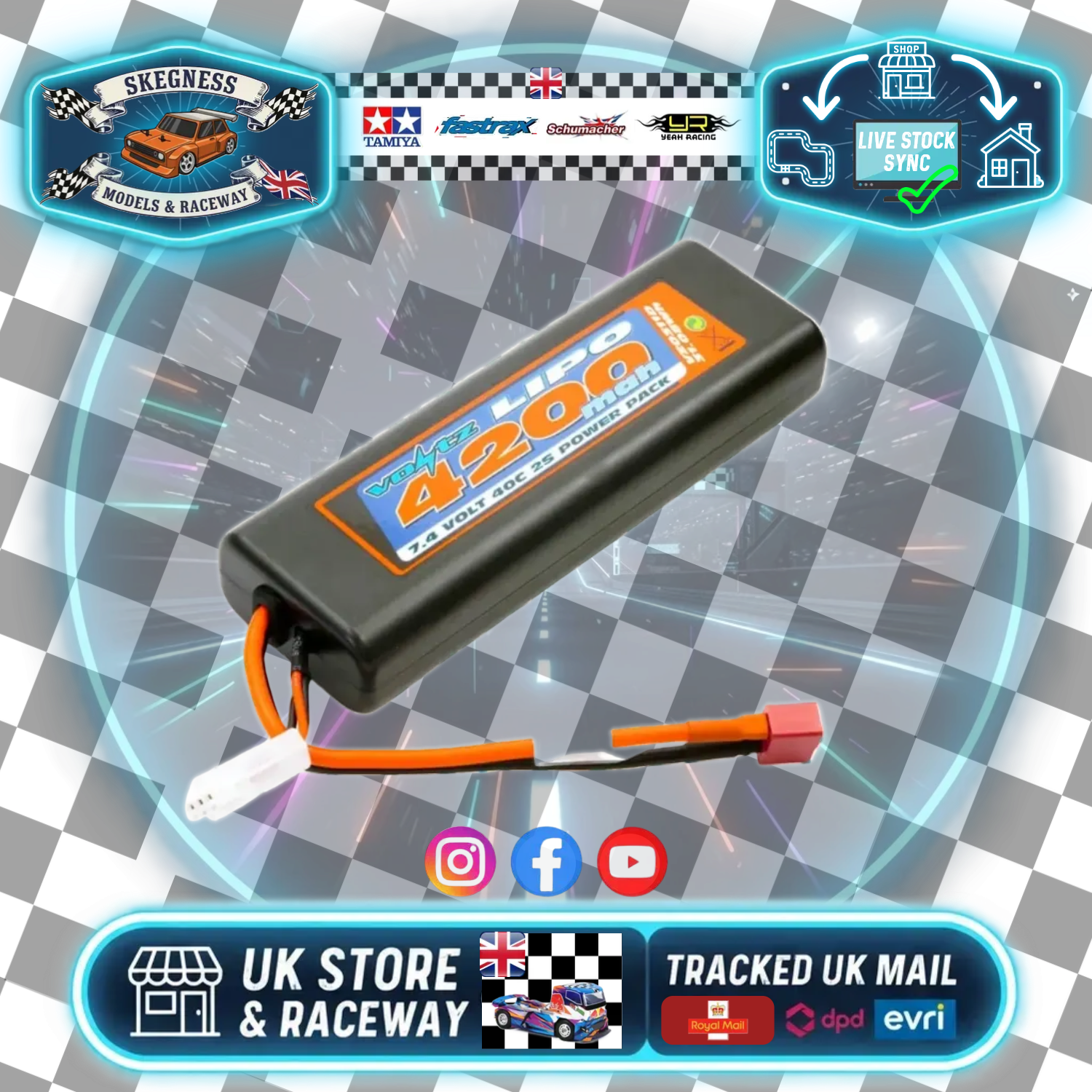 VOLTZ 4200mah ROUND/OVAL CASE 2S 40C 7.4V LIPO STICK PACK - DEANS